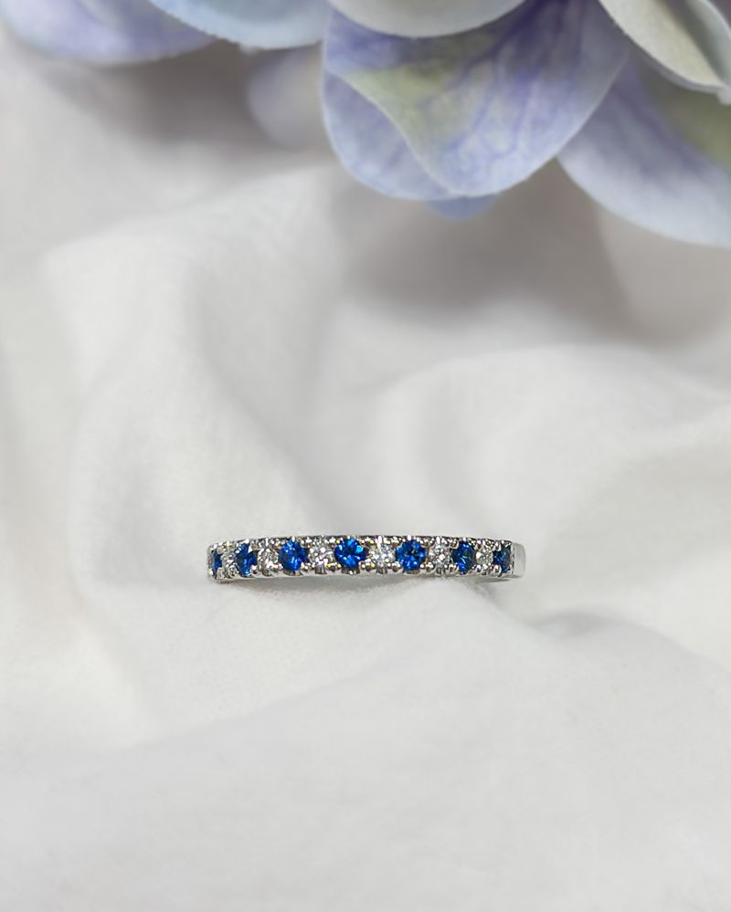 Witgouden rijring met blauwe saffier en diamant. Prachtig om los te dragen, maar kan ook perfect gecomineerd worden met bijvoorbeeld een solitair ring.