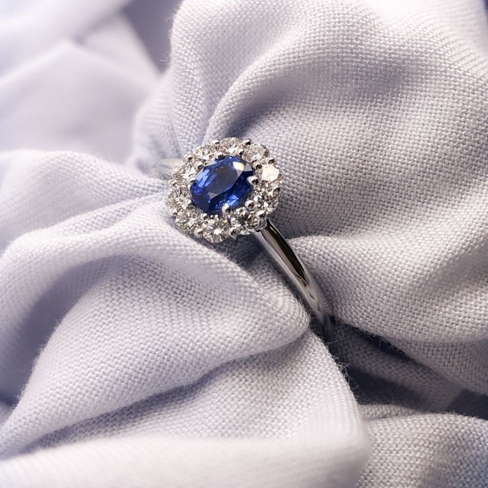 Ring witgoud briljant + saffier