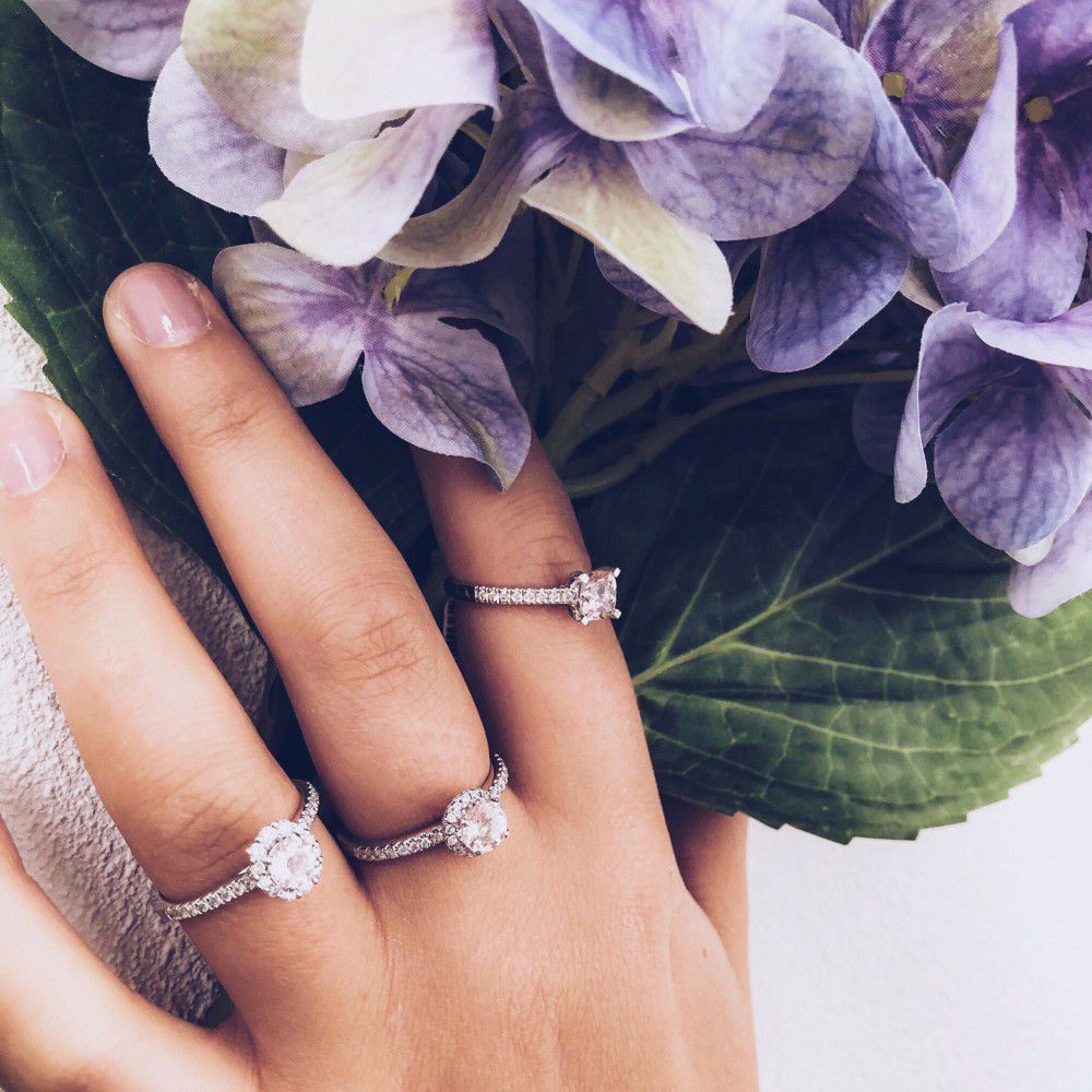 Gerhodineerd witgouden damesring met een zachtroze morganiet middensteen en briljanten zijstenen (totaal 0,32 crt.). Dankzij de verhoogde zetting, kan deze ring naadloos tegen een andere ring worden aangedragen.