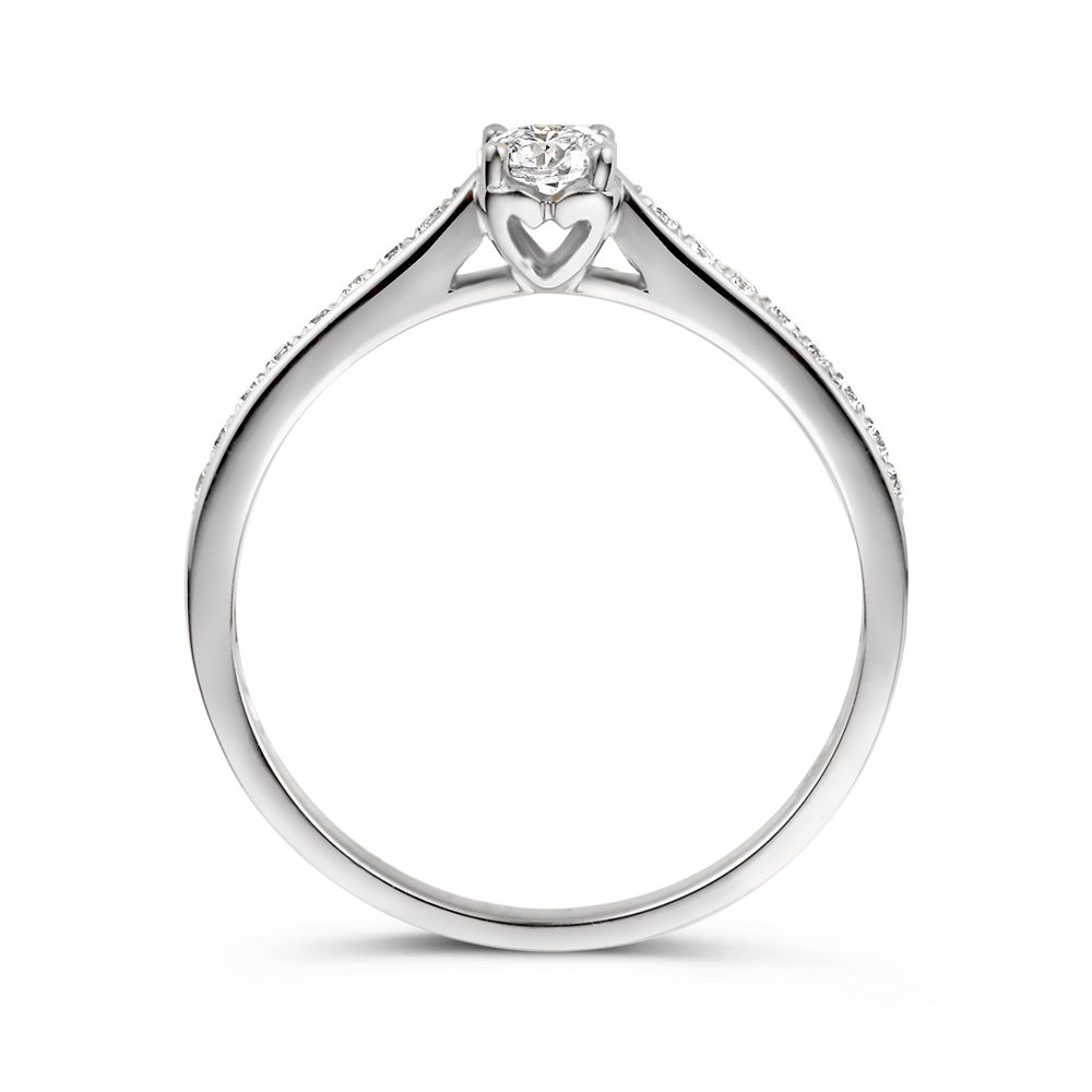 Witgouden ring zirkonia middensteen en fijnere zijstenen. Met de zetpoostjes is een subtiel hartje gevormd, perfect om een geliefde mee te verrassen!