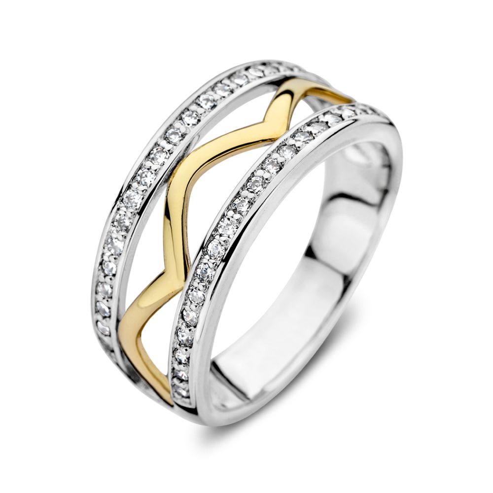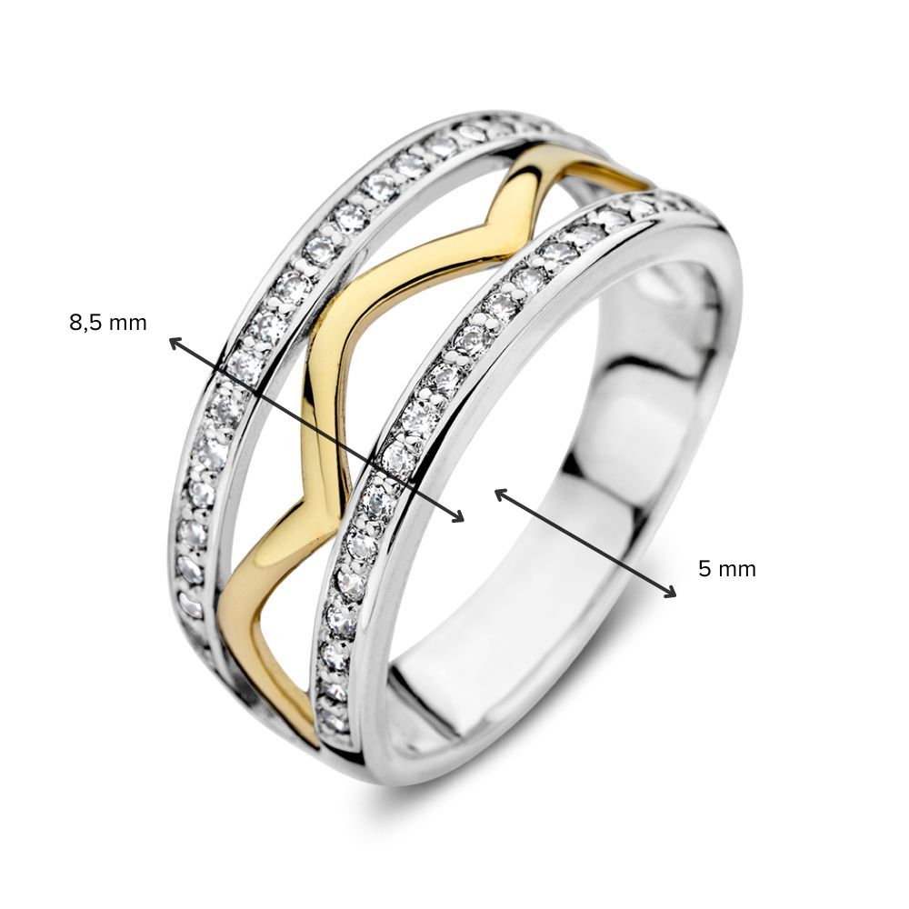 Zilver en 14kt gouden ring (geen oplaag). De zilveren banen van de ring zijn gezet met zirkonia’s.