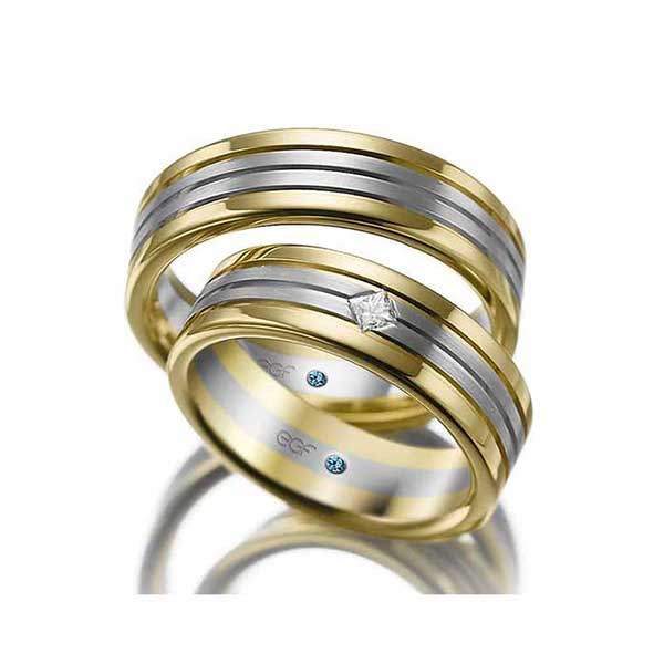 Strakke set trouwringen van geelgoud met witgouden baan, In damesring een princess geslepen diamant van 0.08 ct.