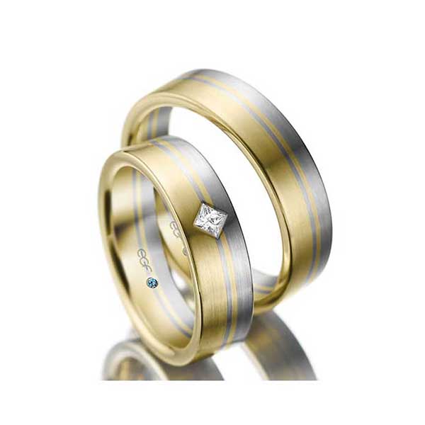 6 mm brede trouwring uitgevoerd in geel met wit goud. In damesmodel diagonaal een diamant gezet in princess slijpsel.