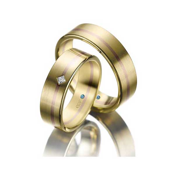 Trouwringen geelgoud roodgouden baan, 6,5 mm breed. In dames model een diamant van 0.03 ct in princess slijpsel.