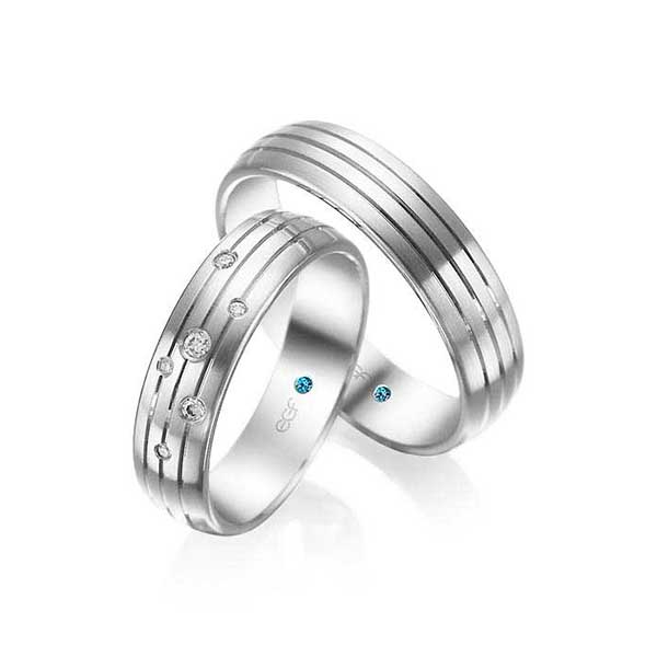 Witgouden trouwringen van 5,5 mm breed, in trouwring van dame een strooizetting van in totaal 0.055 ct.