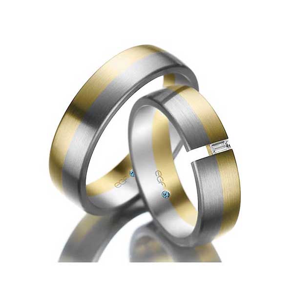 Trouwringen van 6 mm breed, vervaardigd uit wit- met geelgoud in de damesring met een spanzetting diamant van 0.05 ct in baquette slijpsel. Het oppervlakte is gematteerd.