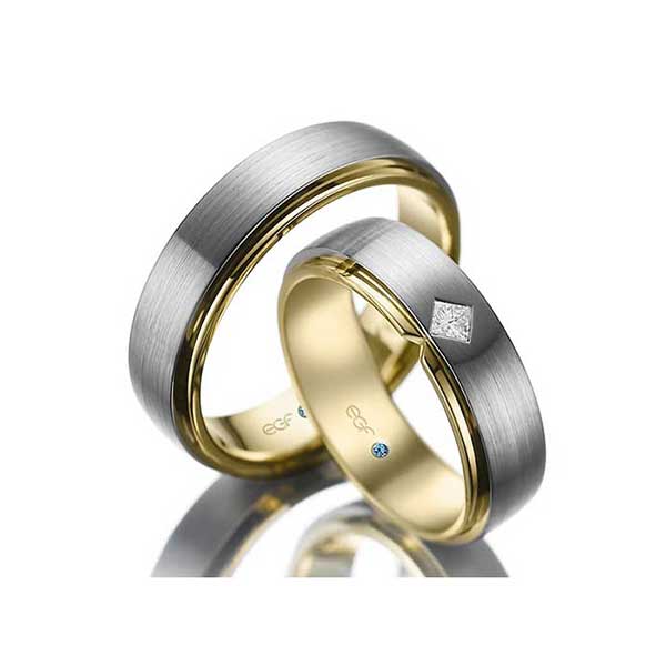 Aparte set trouwringen uitgevoerd in wit en geelgoud met een diamant van 0.10 ct in princess slijpsel.