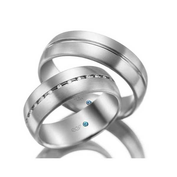 Witgouden trouwringen van 7 mm breed. In de damesring zijn rondom 29 diamanten gezet van 0.005ct.